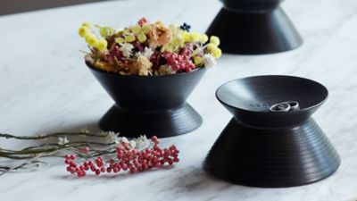 El color negro intenso del recipiente, que hace destacar cualquier objeto que se coloque en él, se consiguió a través de un proceso de teñido con hojas de té cultivadas en la prefectura de Shizuoka.