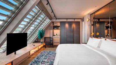 El hotel cuenta también con habitaciones estilo loft, situadas en la azotea, que ofrecen vistas infinitas de la ciudad y río Danubio a través de grandes ventanales inclinados. Coronando el Palacio con su ubicación en la quinta planta, la Suite de la Torre de la Corona está dividida en tres plantas y es la primera suite de Hungría que cuenta con una torre de 48 metros de altura con vistas de 360º de la ciudad. La Suite Real Maria Klotid, cuenta con un amplio dormitorio principal, un baño, una sala de estar y un estudio separado, decorados con una mezcla de muebles modernos e históricos. Con elegantes lámparas de araña, mosaicos de cristal hechos a mano y suelos de parqué, el espacio es una celebración de la artesanía de la región.