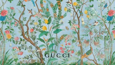 Dicho estampado se compone de flores, insectos y aves, incluyendo libélulas, mariposas y colibríes. Las plantas y los animales están representados a través de la luz y rápidas pinceladas de estilo gráfico tridimensional impreso en su exclusivo lienzo GG.