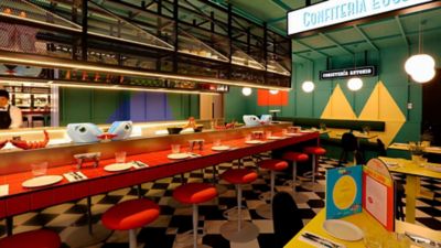 Sin duda alguna, "Las chicas, los chicos y los maniquís" recuperan su ambiente desenfadado, su marcado carácter multicolor con grandes elementos gráficos y sus referencias a la Movida madrileña, al Madrid de los años 80 y al universo visual almodovariano. El salón de la entrada, con una barra de azulejos rojos brillantes, mesas de colores y un ambiente moderno y juvenil es ideal para comidas rápidas y tapeos informales. En este mismo espacio cuelgan del techo carteles luminosos que hacen referencia a los negocios de toda la vida del centro de Madrid, combinados con nombres de personalidades del mundo del espectáculo, hitos y referentes de "la movida”. Pero el espacio cuenta con tres salones más: